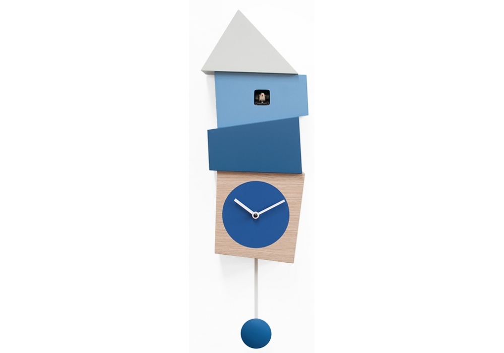 Crooked conçue par Alberto Sala pour Progetti est une horloge coucou en bois et peinte avec des peintures non toxiques. Mouvement à quartz à piles avec un capteur photosensible qui interrompt automatiquement la sonnerie en l'absence de lumière. Disponible en différentes finitions.