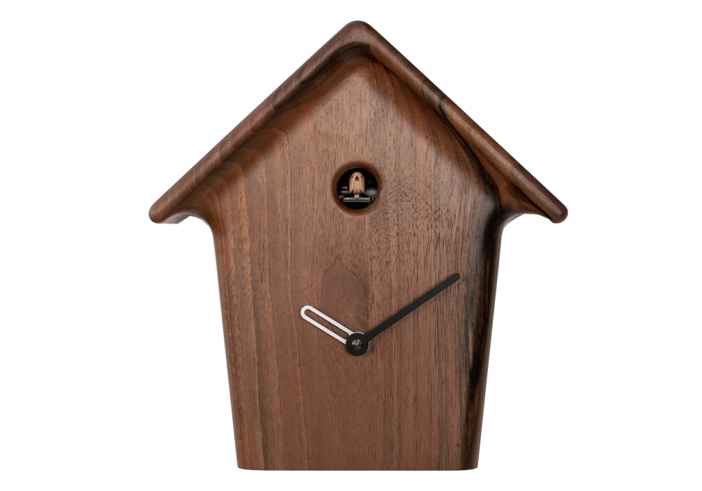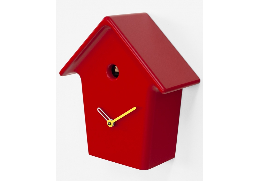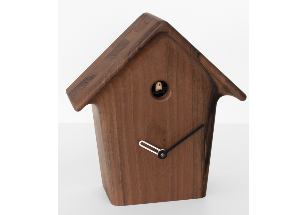 Mochi Mochi conçue par Krit Jiratkaruen pour Progetti est une horloge coucou murale en bois peint ou en noyer massif et finie à la main. Le mouvement coucou, de conception allemande, est de haute qualité et est alimenté par deux piles, possède un capteur photosensible qui ne le fait pas chanter quand il fait noir. Un bouton poussoir permet de régler l'intensité du son ou de l'éteindre complètement. Disponible en différentes finitions.