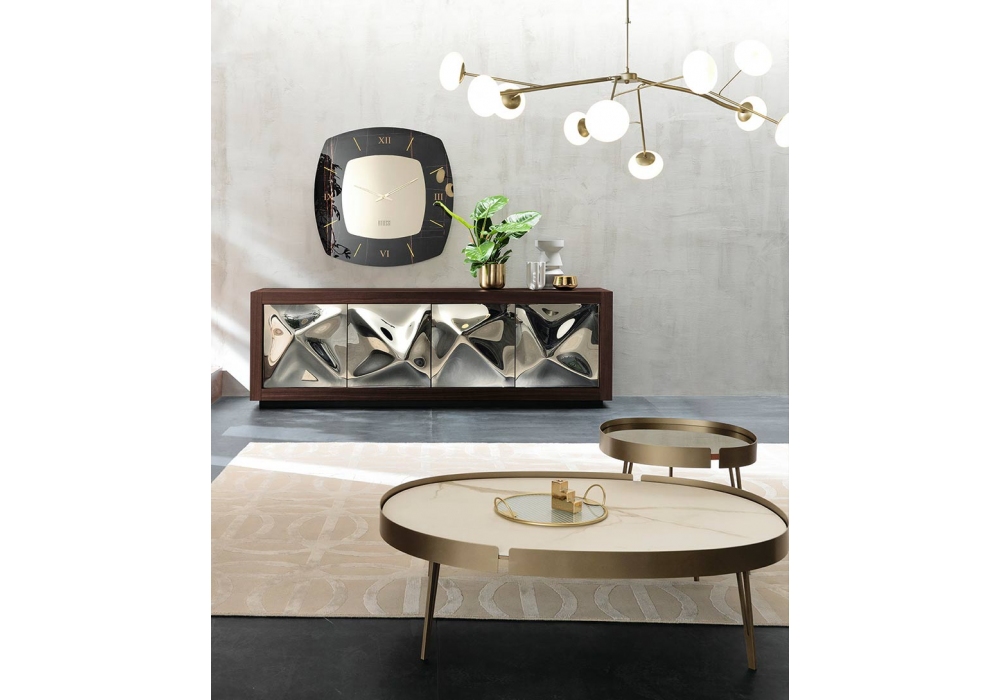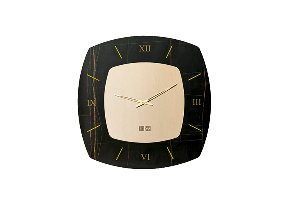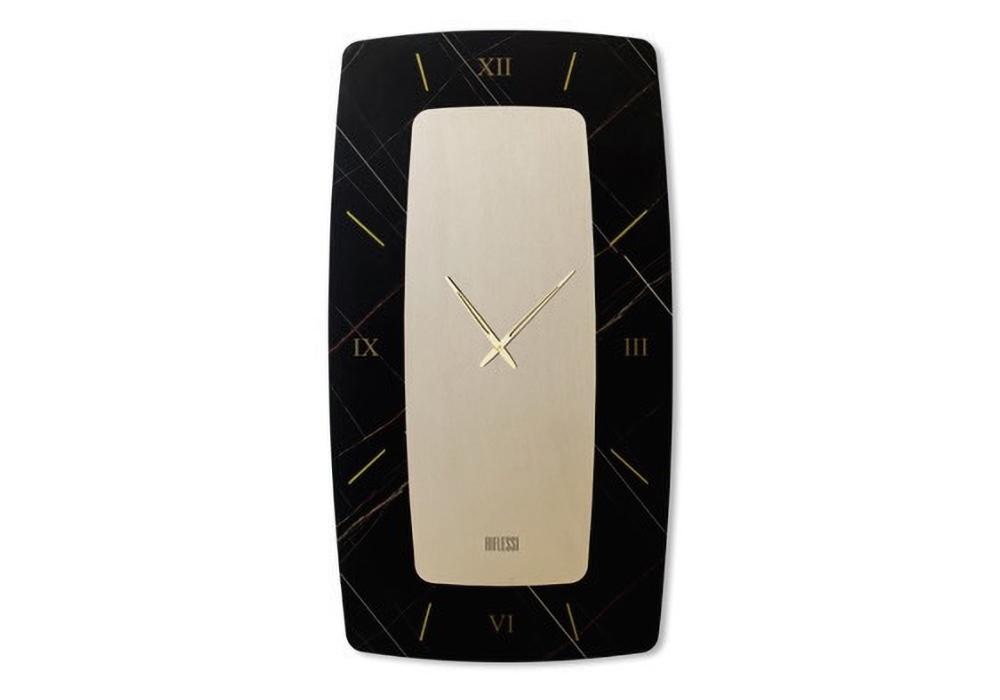 Sanremo conçue par Riflessi est une horloge en verre miroir bronzé avec cadre sérigraphié effet marbre en finition Sahara Noir. Disponible en 2 dimensions.