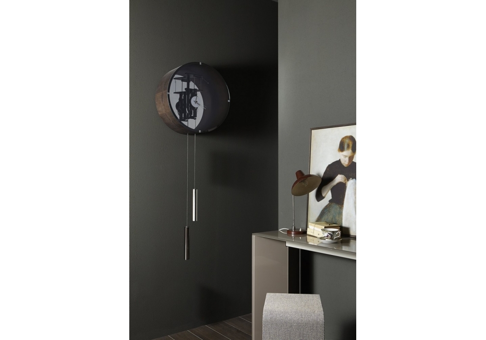 Tic Tac 14 conçue par Gallotti&Radice est un Pendule à chargement manuel. Panneau en frêne teinté tabac ou laqué noir pore ouvert et devant en verre extralight de 6mm d’épaisseur trempé biseauté. Fond en acier inox brillant “supermirror”. Mécanisme en aluminium anodisé noir et laiton chromé. Mécanisme de l’horloge par batterie. Gravure personalisée, sur demande.