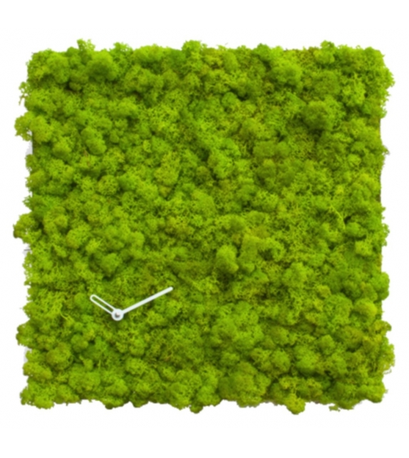 Clock_Circle conçue par Studio Kuadra pour Progetti est une horloge carrée en acier et Moss lichen par Verde Profilo. Mouvement à quartz à piles. Il est possible d'accrocher l'horloge de tous les côtés.