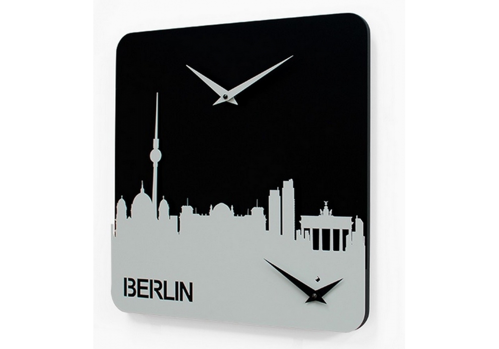 Time Travel Berlin conçue par Gianluca Minchillo pour Progetti est une horloge murale en bois peint en noir et métal gris. Deux mouvements à quartz à piles.