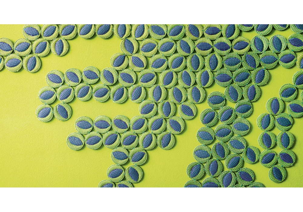 Metamorphosis Morpho conçu par Campana pour Paola Lenti est une décoration murale créée par l'union d'éléments de forme ronde sur lesquels une application de forme ovale est cousue. Ces éléments sont composés d'une couche supérieure en tissu Brio et d'une couche inférieure en feutre synthétique, assemblées et bordées en point de peigne. Les éléments sont ensuite assemblés pour former la surface de la tapisserie, qui peut ainsi prendre n'importe quelle forme et taille. Disponible en différentes combinaisons de couleurs.