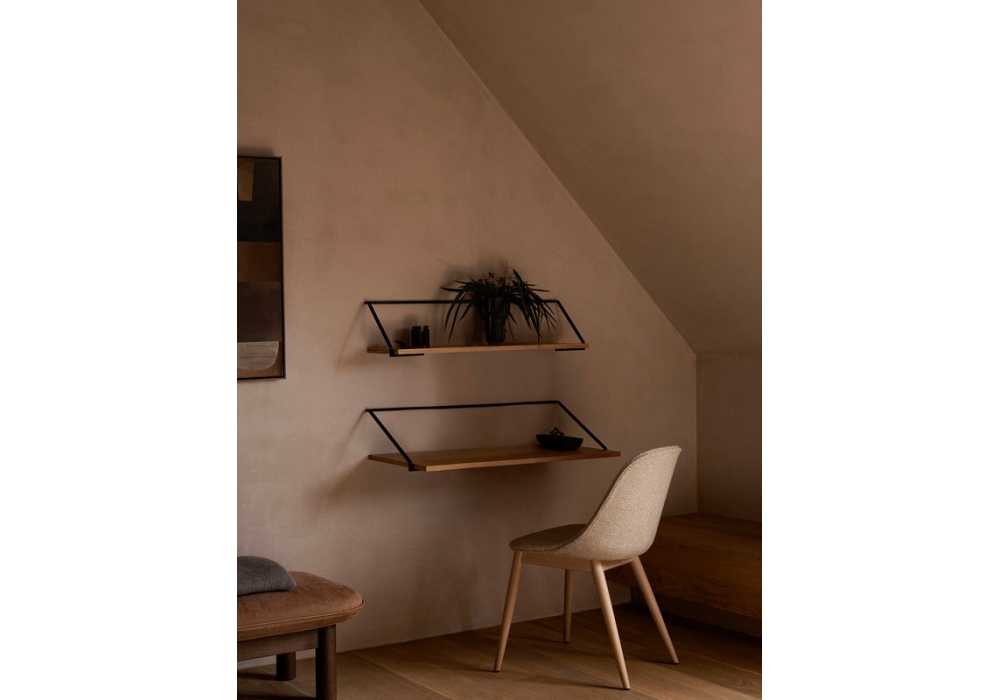 Rail conçue par Keiji Ashizawa pour Audo Copenhagen est une étagère en chêne et acier enduit de poudre noire. Disponible en différentes finitions.
