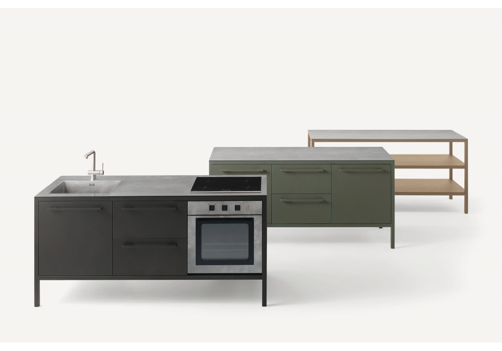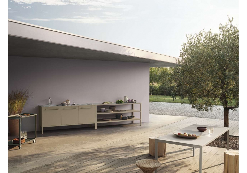 Frame Outdoor conçu par Salvatore Indriolo pour Fantin est un comptoir / cuisine disponible pour l'extérieur grâce à un traitement de cataphorèse qui empêche la formation de rouille. Composé d'un plateau en acier inoxydable et d'une structure disponible en différentes finitions. Possibilité d'ajouter des accessoires et différentes configurations.