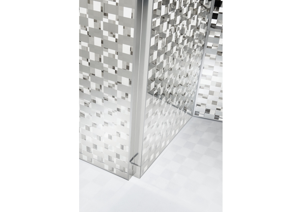 Fragment conçu par Nendo pour Glas Italia, est un écran en verre trempé extra-léger, orné d'un décor en damier double face. Deux panneaux de verre, aux damiers orientés perpendiculairement, sont appliqués sur les deux faces d'un cadre en aluminium poli brossé, séparés par un espace de quelques centimètres. Cela crée un jeu de miroirs, de revêtements et de transparences qui trompe l'observateur, dissimulant et confondant les objets réfléchis avec ceux projetés, et vice versa. L'écran est composé de panneaux modulaires articulés entre eux.