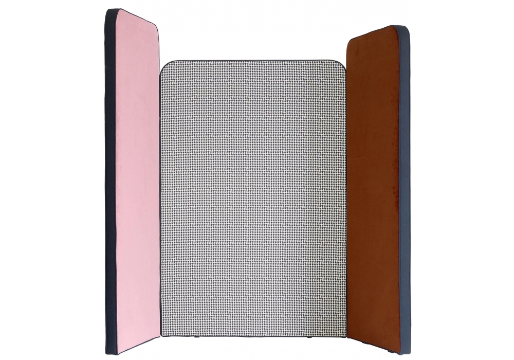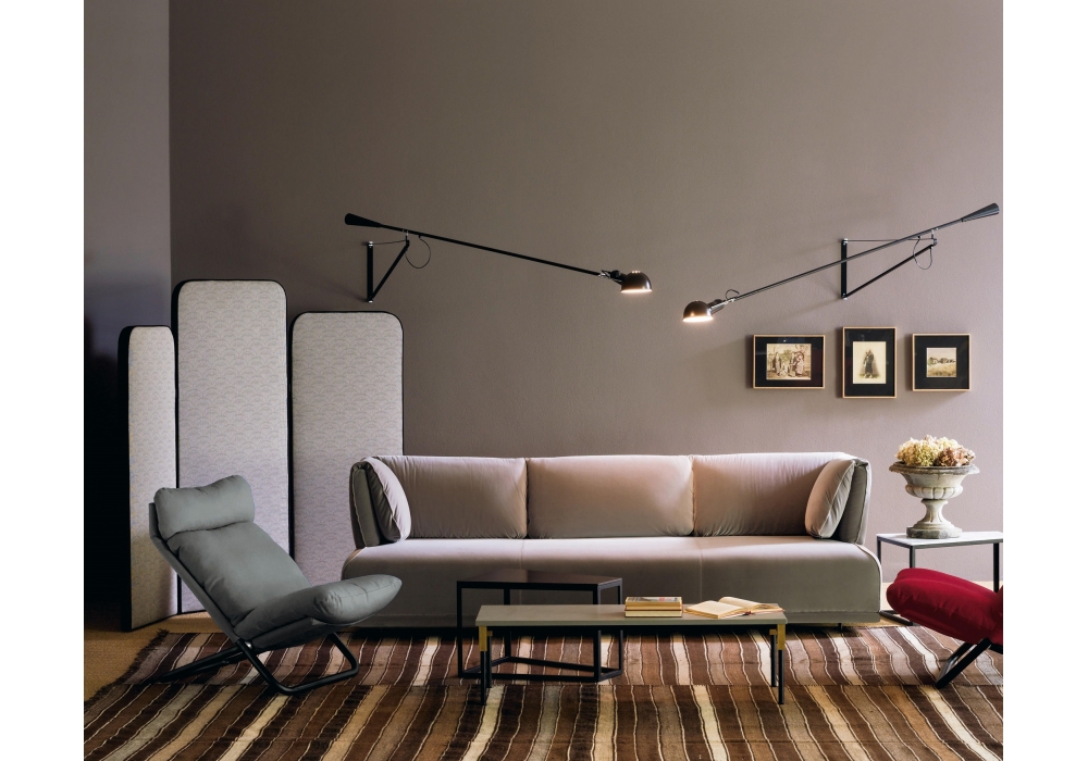 Diva conçu par Bernhardt & Vella pour Arflex est un paravent modulaire composé de panneaux avec structure en contreplaqué de peuplier, rembourrage en fibre de polyester et le revêtement de tissu. Pieds réglables en PVC noir.