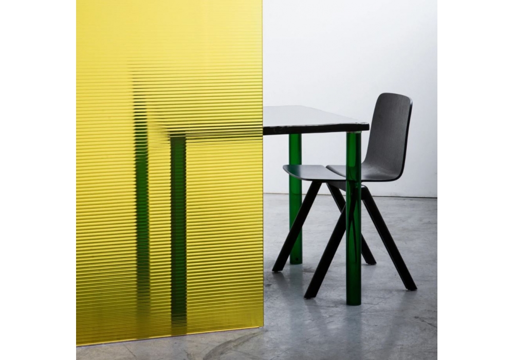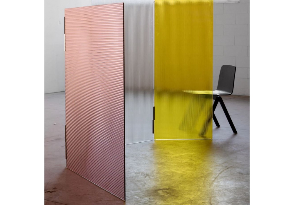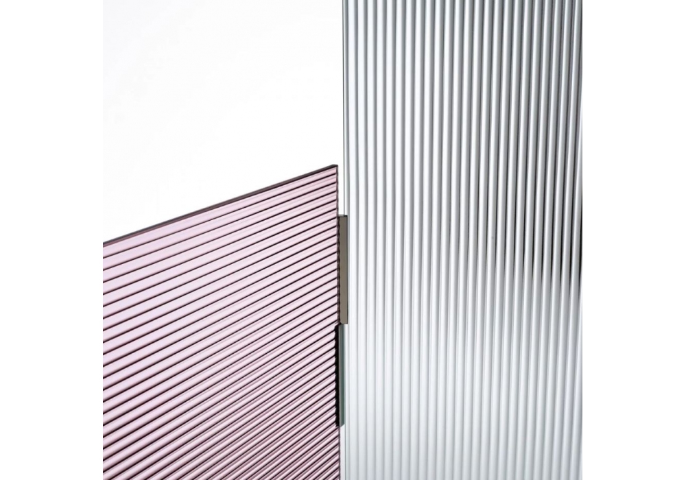 Rayures, conçu par Ronan et Erwan Bouroullec pour Glas Italia, est un paravent modulaire composé de panneaux articulés en verre Flutes feuilleté et trempé. Un miroir est également disponible et peut être positionné à une extrémité de la composition. Le veinage du cristal est horizontal ou vertical, selon le format du panneau. Les charnières sont en laiton chromé anthracite.