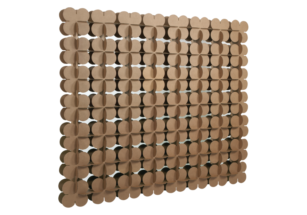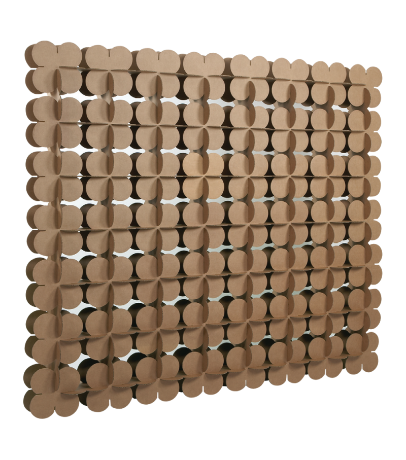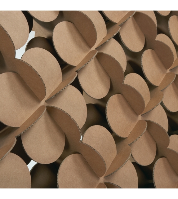 Fiorello designed by Kubedesign is a partition wall with interlocking elements, made of corrugated cardboard. It is available in natural cardboard finish. On request metal base. Easy to assemble, it is sold in form of two square meters.