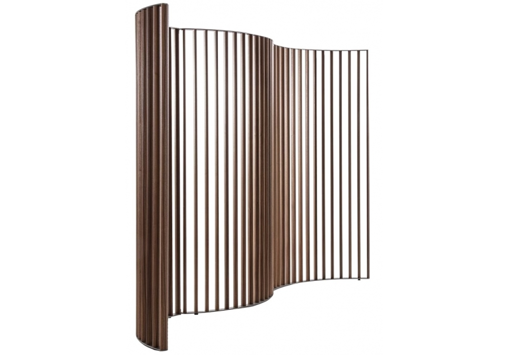 Gamen conçu par T. Colzani pour Porada est un paravent modulaire composé de deux ou plusieurs modules incurvés avec des profils en aluminium recouverts de noyer Canaletta. Structure en métal finition étain et pieds réglables. Les modules sont articulés entre eux permettant des configurations libres.