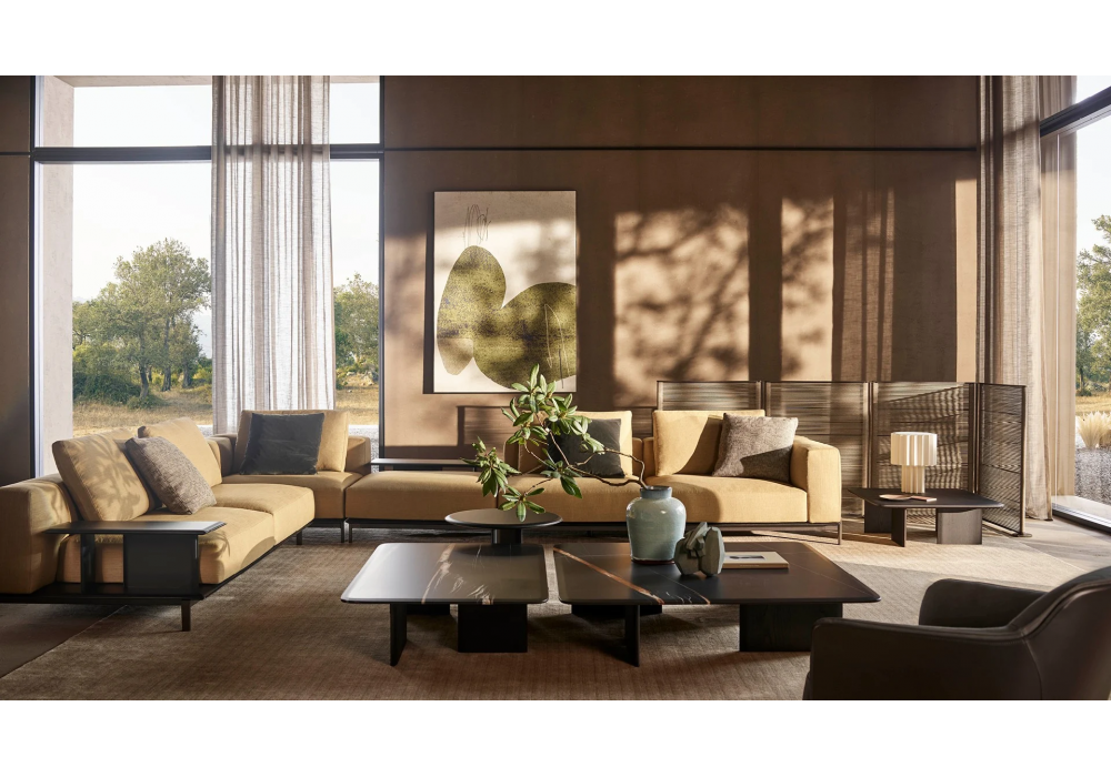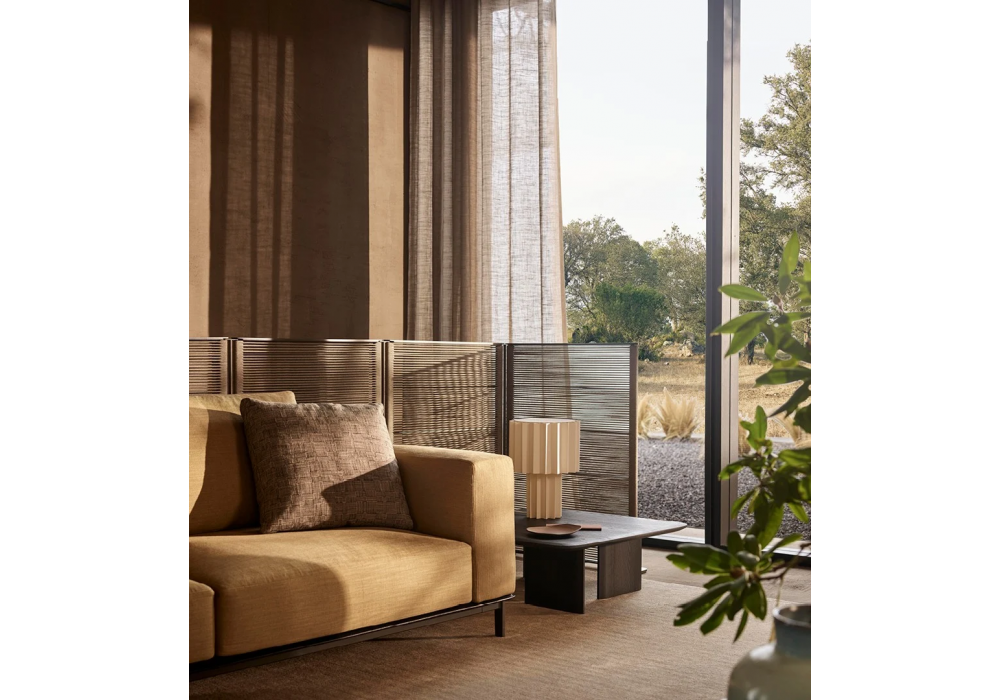 Hima conçu par Jean-Marie Massaud pour Poliform est un paravent modulaire avec structure laquée nickel marron mat et corde dans la couleur cenere.