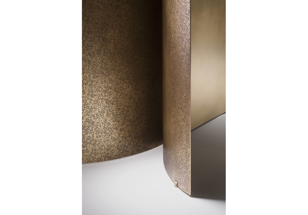 Monolìte conçue par TipStudio pour DeCastelli est une cloison composée de deux plaques de laiton symétriques et concaves. Lumière LED dimmable intégrée des deux côtés.
