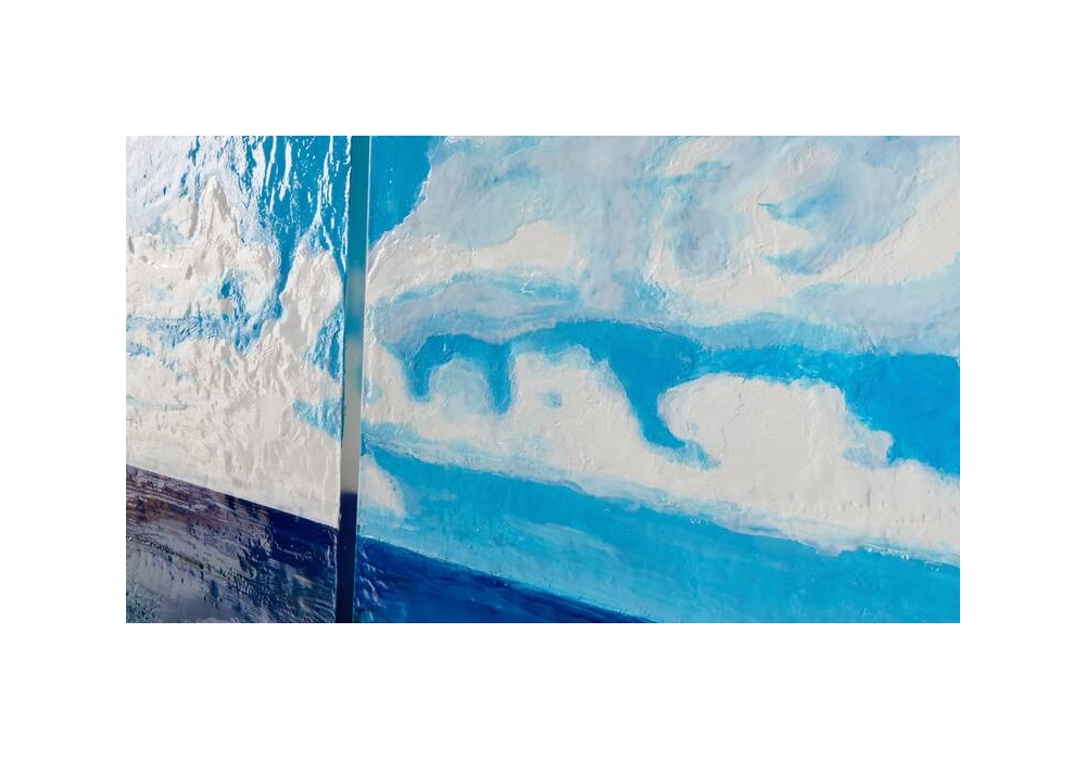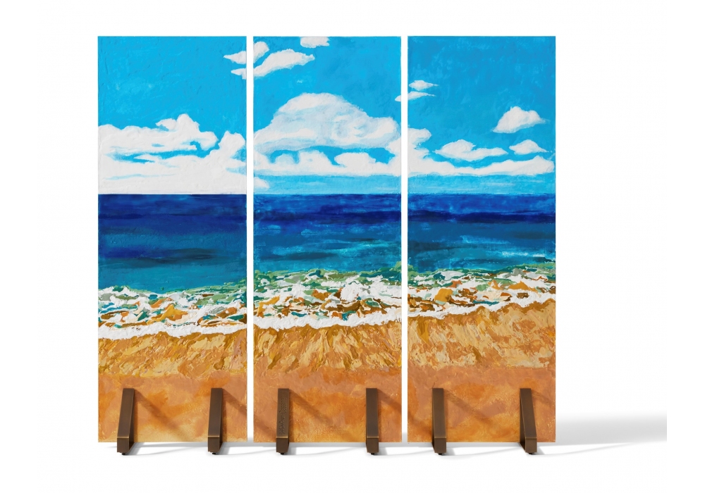 Paravento Risacca conçu par Gaetano Pesce pour Cassina est un paravent composé de trois panneaux fixés sur six bases en laiton, ils sont réalisés en coulant une résine transparente dans un moule en bois similaire en effet à la peinture à l'huile, capable de retourner, imprimé sur le matériau, chaque geste de l'artiste, donnant à l'œuvre cette tridimensionnalité qui la rend unique. Une enceinte bluetooth est insérée dans le pied du panneau central.