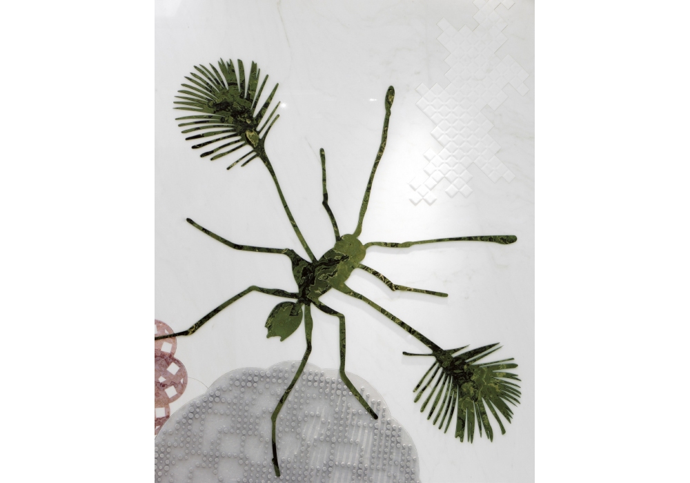 Macrosterias conçu par Patricia Urquiola pour Budri est un panneau décoratif sol/mur. Des formes graphiques finement incrustées émergent grâce également aux couleurs étonnantes des pierres naturelles. Pour créer cette installation, plus de 40 types de marbre et d'onyx ont été utilisés, choisis et travaillés avec un soin de composition extrême. L'installation, composée de différents motifs, forme un long tapis incrusté et ajouré, un tapis tropical. Sur demande, il est possible de personnaliser la longueur du tapis.