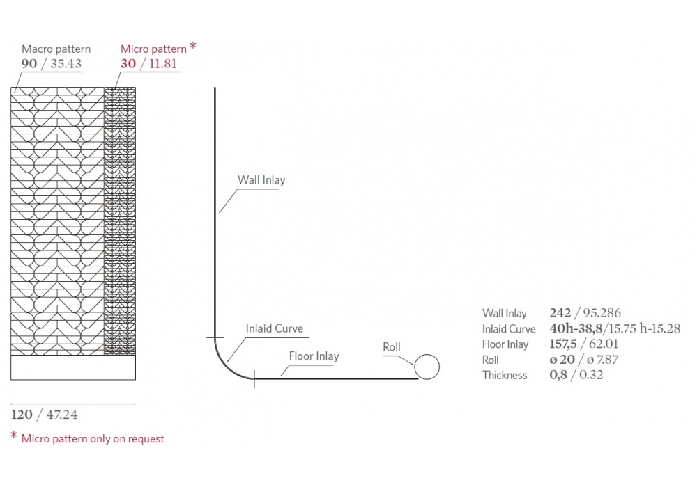 Amelie conçu par Patricia Urquiola pour Budri est un papier peint composé d'un revêtement mural, d'un élément incurvé et d'un sol incrusté. Le rouleau de marbre Aquarel Green Onyx complète la création. Micro motif uniquement sur demande.