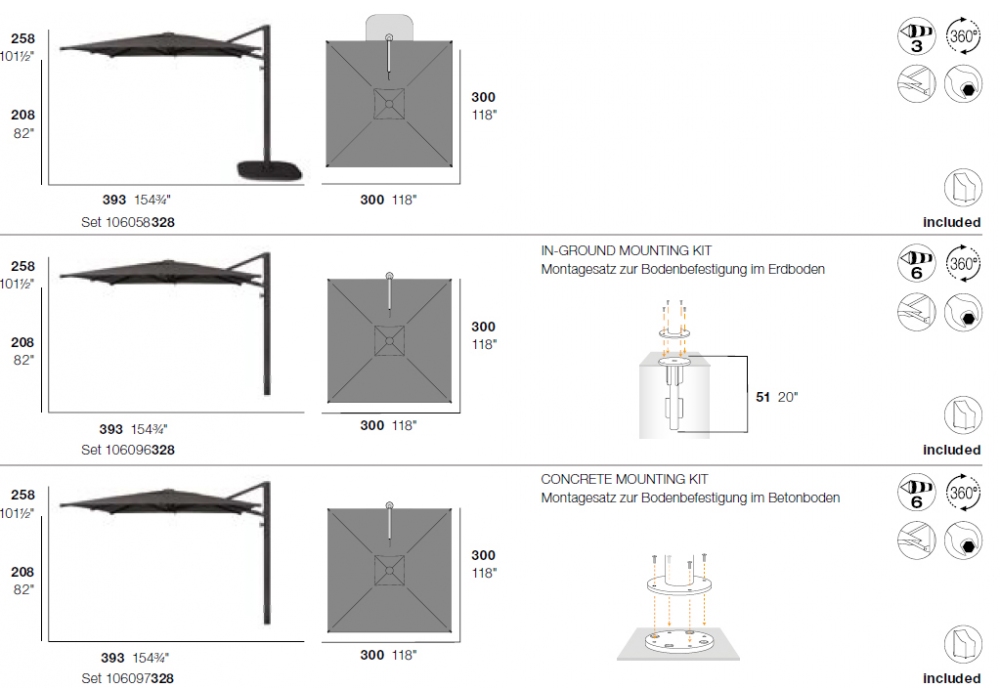 *Pour assurer la stabilité à des niveaux de vent allant jusqu'à 6 (39-49 km/h/24-30 mph), les articles pour ce niveau de vent ne sont disponibles qu'avec un kit de montage au sol.