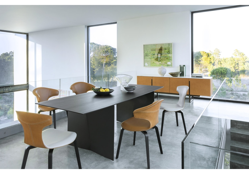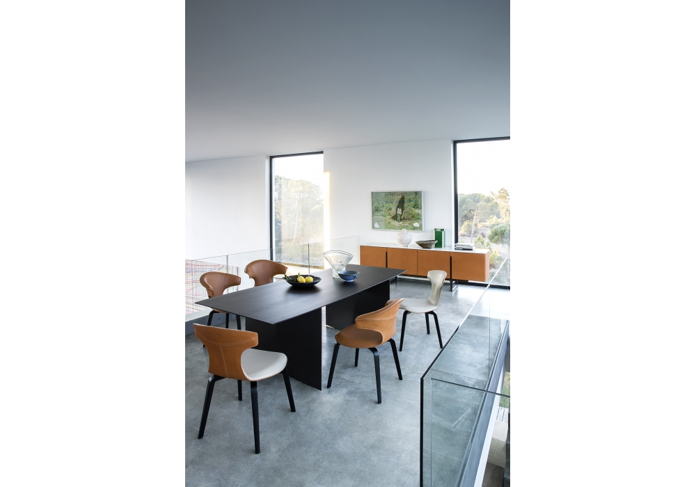 Montera, conçu par Roberto Lazzeroni pour Poltrona Frau, est un petit fauteuil avec une coque en polyuréthane rigide moulé, un rembourrage en mousse de polyuréthane et un revêtement en cuir Pelle Frau®. Disponible en deux versions : coque en cuir sellerie et revêtement intérieur en cuir ou entièrement en cuir, uni ou bicolore. Le cuir et le cuir sellerie, avec des bords nets, sont cousus ensemble avec des fils contrastés. La version tout cuir présente des coutures ton sur ton. Pieds en frêne massif ou en acier.