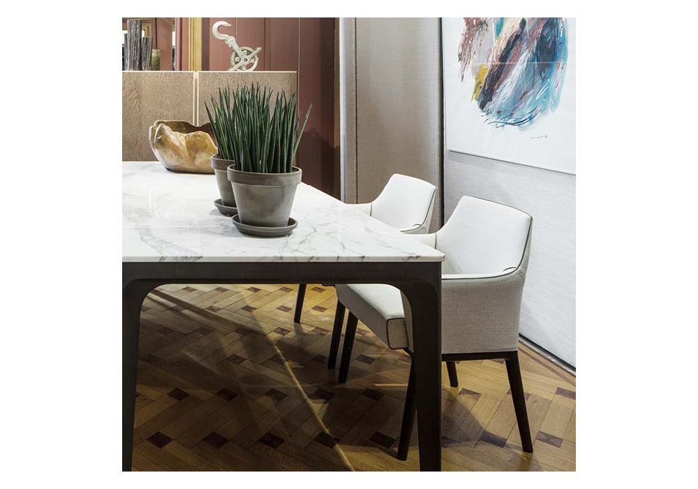 Alina conçu par Antonello Mosca pour Giorgetti est un fauteuil avec structure en Polimex, avec rembourrage en mousse de polyuréthane flexible. La base est en noyer canaletto massif ou en érable massif poli, l'assise est amovible et revêtue de tissu ou de cuir, en différentes finitions. Le profil du fauteuil est toujours en cuir, de différentes couleurs.