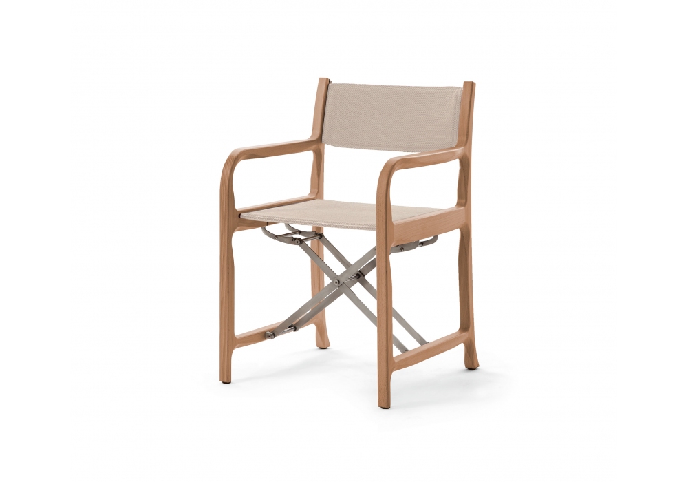 298 Unicredit Pavilion Project conçue par Michele De Lucchi pour Cassina est une chaise pliante avec accoudoirs en bois de hêtre massif, mécanisme en acier inoxydable brossé et revêtement en tissu.