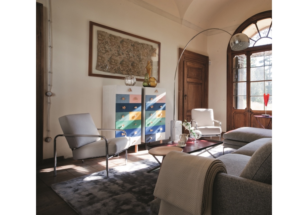 852 Susanna conçu par Gabriele Mucchi pour Zanotta est un petit fauteuil avec structure en acier chromé, ou nickel-satiné naturel ou noir, ou verni noir. Revêtement en tissu ou en cuir. Dans la version tissu, les accoudoirs sont en cuir 95.
