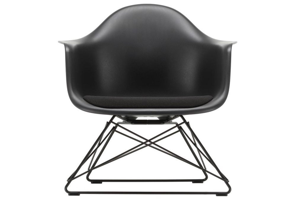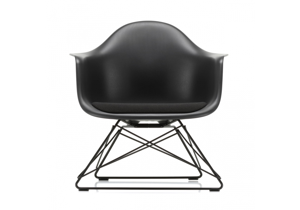 Eames Plastic Armchair LAR conçu par Charles et Ray Eames pour Vitra est un fauteuil avec coussin de la collection LAR avec coque en polypropylène disponible en différentes finitions et coussin en tissu. Base avec fils en acier avec montants croisés en différentes finitions.
