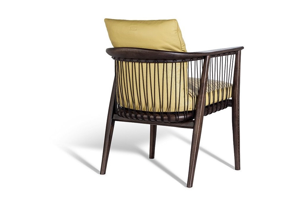 Viola conçue par AB Concept pour Poltrona Frau est un petit fauteuil avec structure en frêne massif teinté Moka ou Wengé, agrémenté d'un tissage fait de cordons en cuir marron foncé ou naturel. Coussins d'assise et dossier tapissés en tissu ou cuir.
