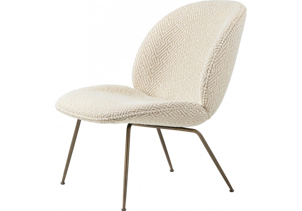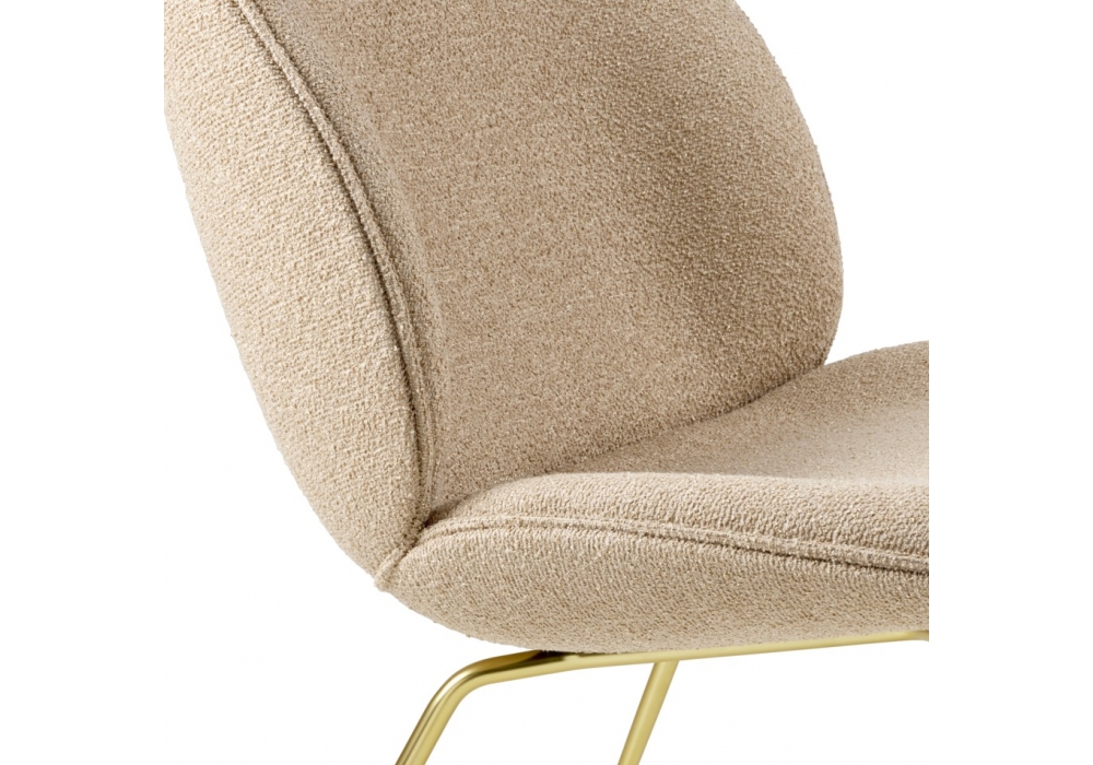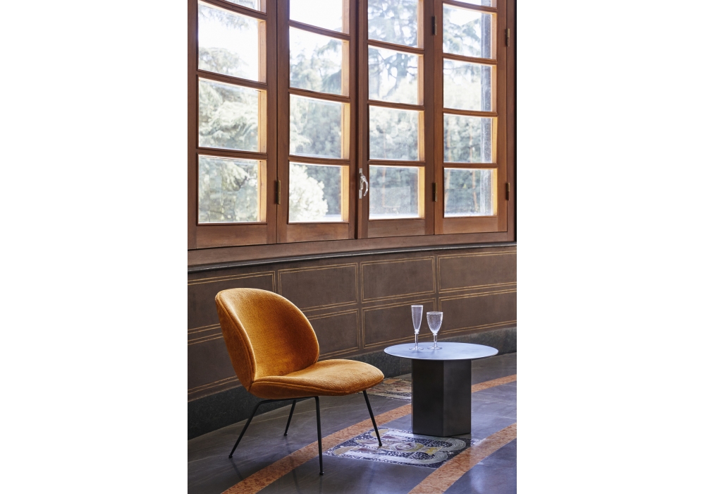 Beetle conçue par GamFratesi pour Gubi est une petit fauteuil composée d'une coque en contreplaqué rembourrée de polyuréthane et de pieds en métal. Il est disponible avec un revêtement en tissu ou en cuir.