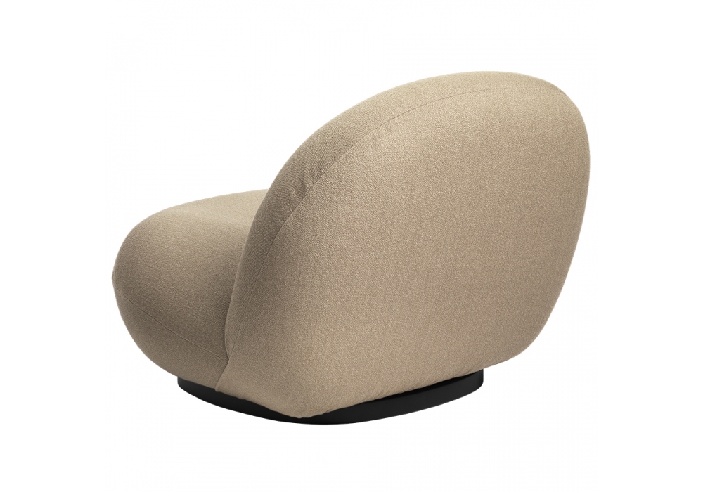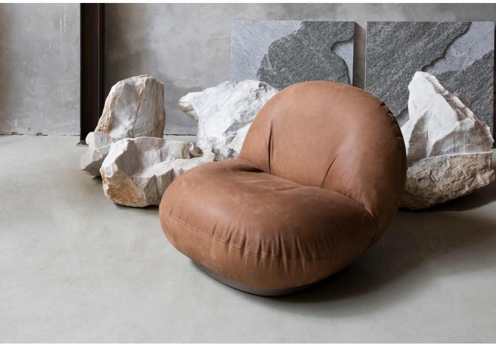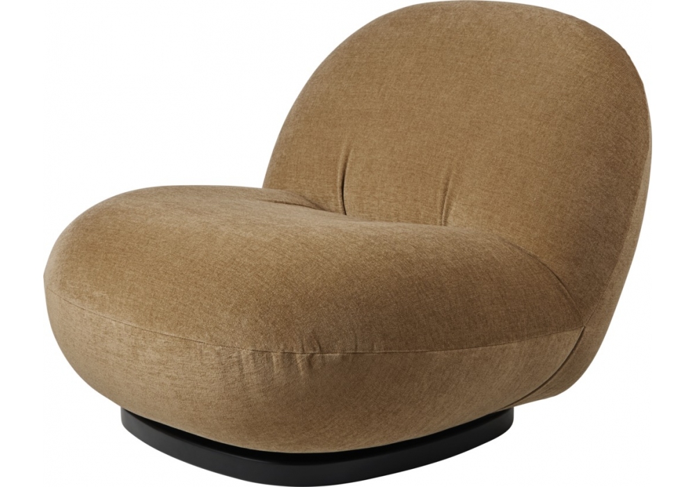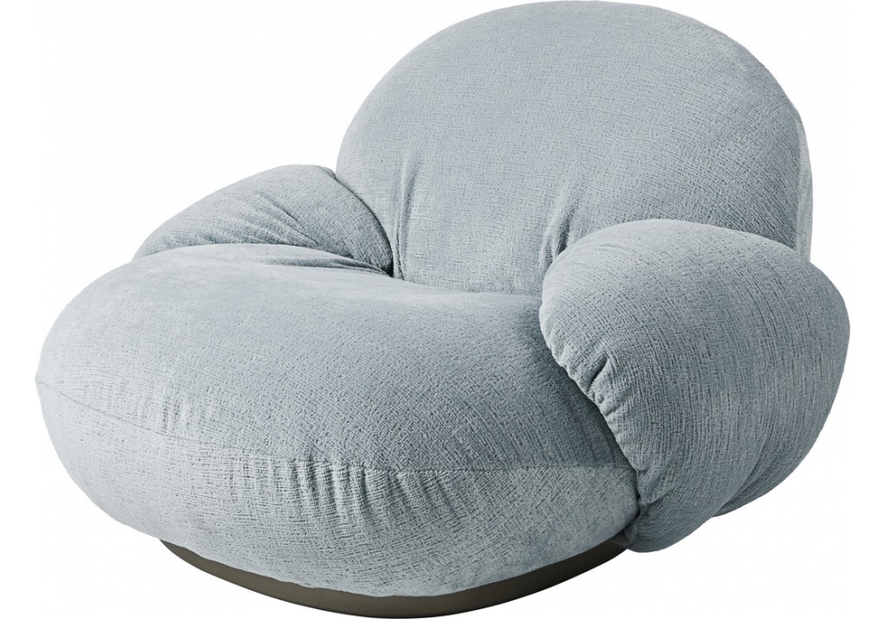Pacha conçu par Pierre Paulin pour Gubi est un fauteuil lounge entièrement rembourré et recouvert de tissu ou de cuir avec base en bois. Il est disponible avec et sans accoudoirs et également en version pivotante.