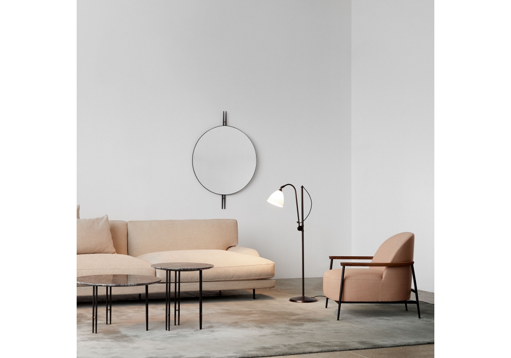 Sejour conçue par GamFratesi pour Gubi est une chaise longue entièrement rembourrée et revêtue de cuir ou de tissu avec base en métal et accoudoirs en bois.