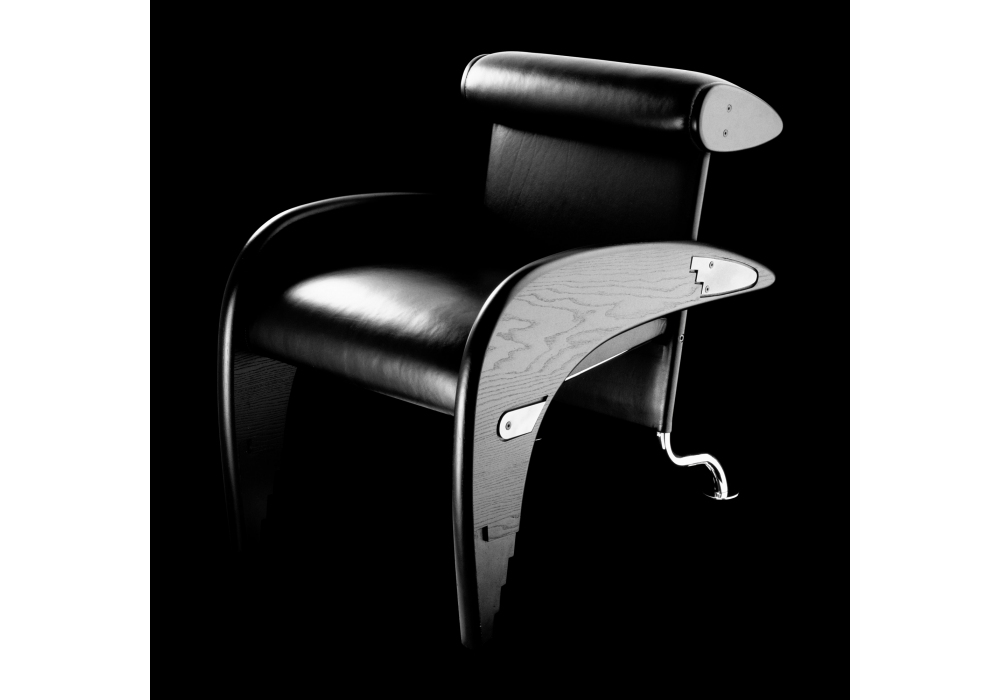 Otello conçu par Massimo Iosa Ghini pour Memphis Milano est un petit fauteuil en bois et métal. Rêvetement en cuir.
