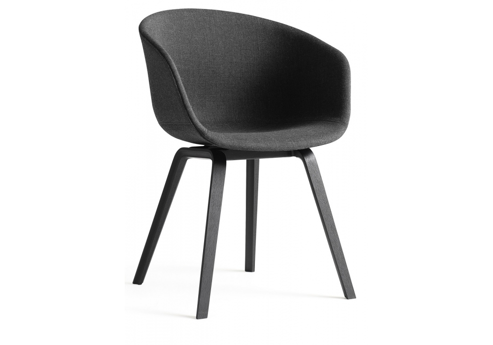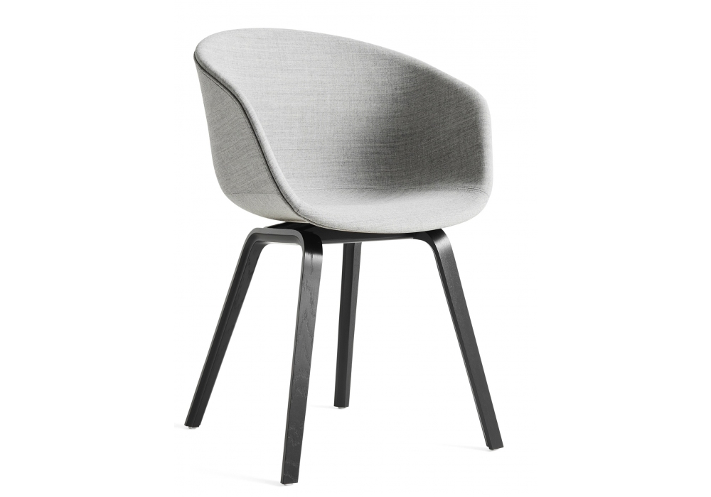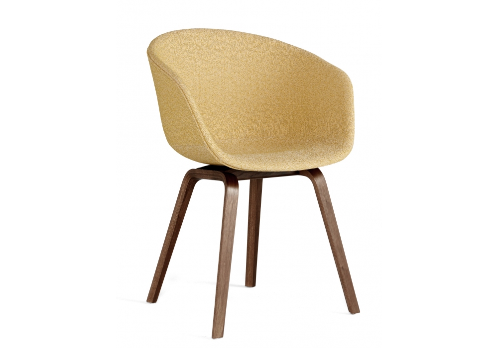About a Chair AAC 23 conçue par Hee Welling & Hay pour Hay est une chaise avec coque en polypropylène moulé par injection avec accoudoir, rembourrage intégral et pieds en bois de chêne ou de noyer. Disponible en différents revêtements.