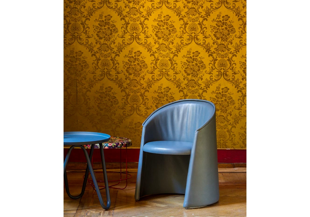 Husk conçu par Marc Thorpe pour Moroso est un petit fauteuil en mousse de polyuréthane injectée ignifuge sur structure interne en acier et bois; Patins en PVC. Revêtement en tissu ou en cuir.