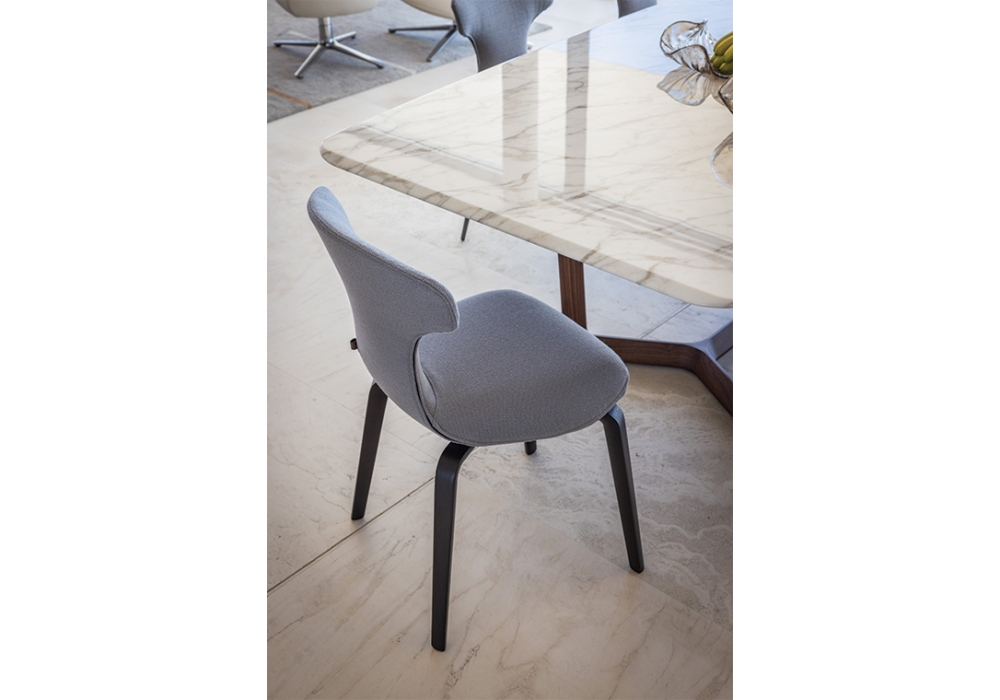Montera Mas conçu par Roberto Lazzeroni pour Poltrona Frau est un petit fauteuil avec coque en polyuréthane rigide moulé recouvert de cuir ou de tissu Pelle Frau, et pieds en acier peint ou en frêne massif teinté. Montera Mas diffère du modèle original par le rembourrage accru.