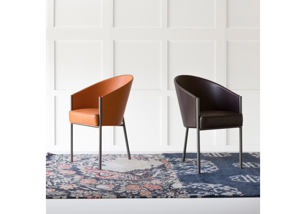 Costes Pelle conçu par Philippe Starck pour Driade est un fauteuil avec structure en acier finement brossé peint en couleur titane et coque en contreplaqué courbé avec rembourrage en polyuréthane. Rembourrage coussin et dossier en cuir non déhoussable. Disponible en différentes finitions. Usage interne uniquement.
