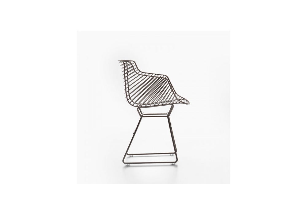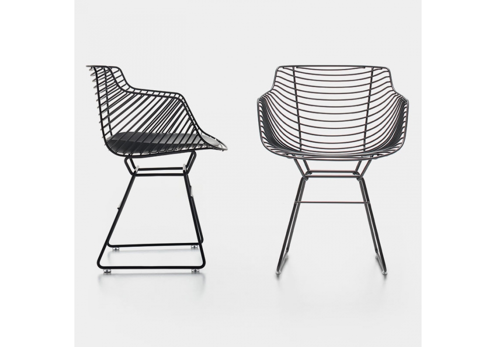 Flow Filo conçu par Jean Marie Massaud pour MDF Italia est un fauteuil avec structure portante en fil d'acier, avec piètement luge, disponible en différentes finitions. La version peinte en bronze mat ou en nickel noir convient également à une utilisation en extérieur. Sur demande, il est possible d'ajouter des coussins pour l'assise et le dossier, en différentes couleurs.