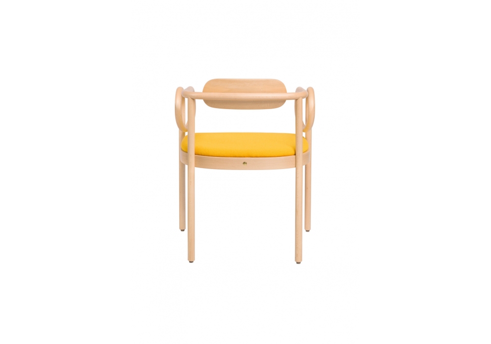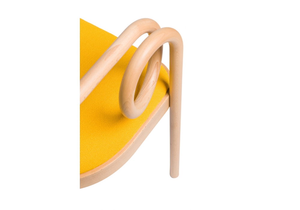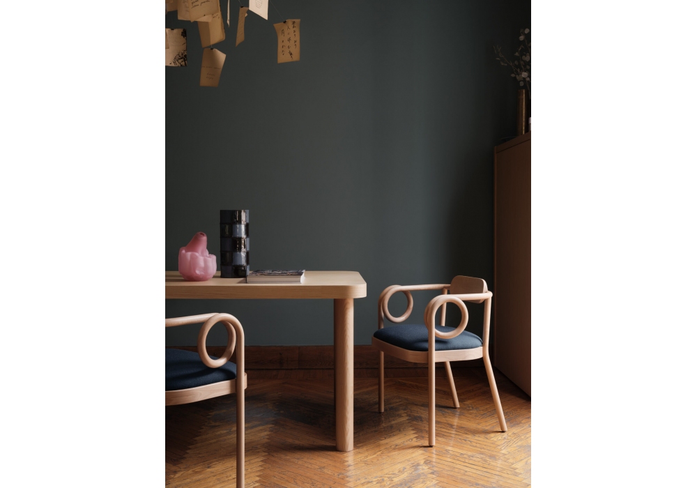Loop Dining conçu par India Mahdavi pour Gebrüder Thonet Vienna est un fauteuil avec structure courbée en hêtre. Assise rembourrée recouverte de tissu ou de cuir, dossier en bois. Disponible en différentes finitions.
