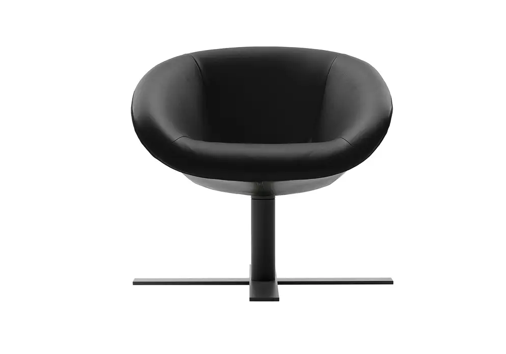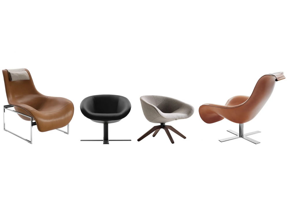 Mart, conçu par Antonio Citterio pour B&B Italia, est un petit fauteuil avec base pivotante en acier chromé ou peint. Revêtement en cuir ou en tissu dans différentes finitions.