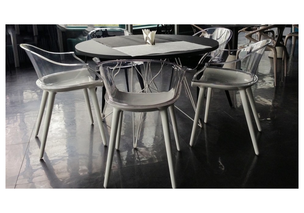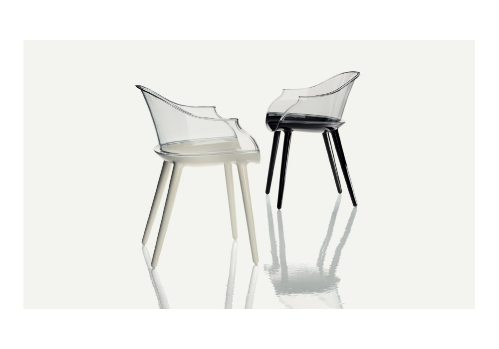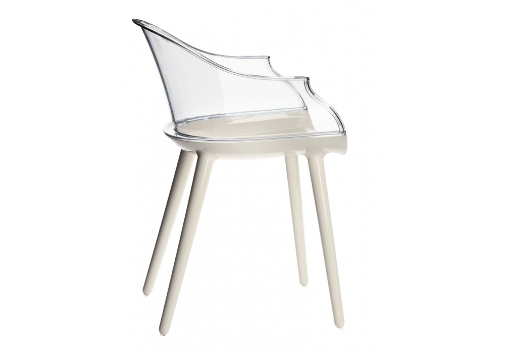 Cyborg conçu par Marcel Wanders pour Magis est un petit fauteuil avec une structure en polycarbonate blanc brillant ou noir brillant et un dossier en polycarbonate transparent.