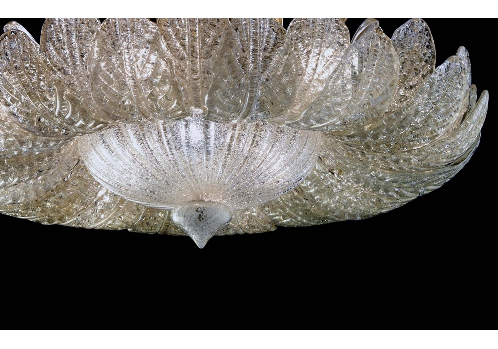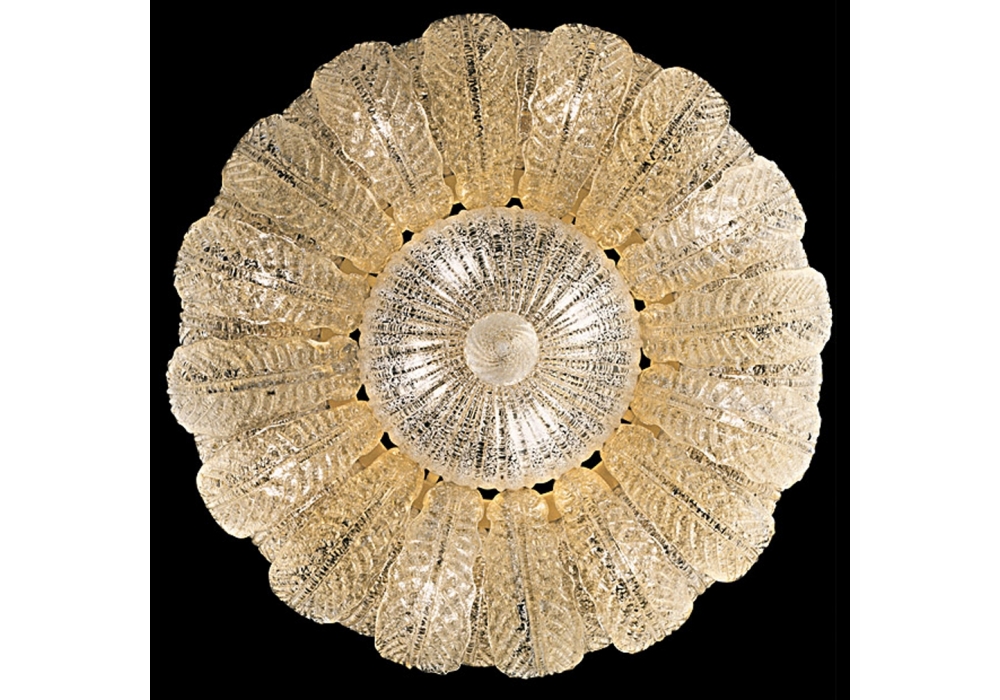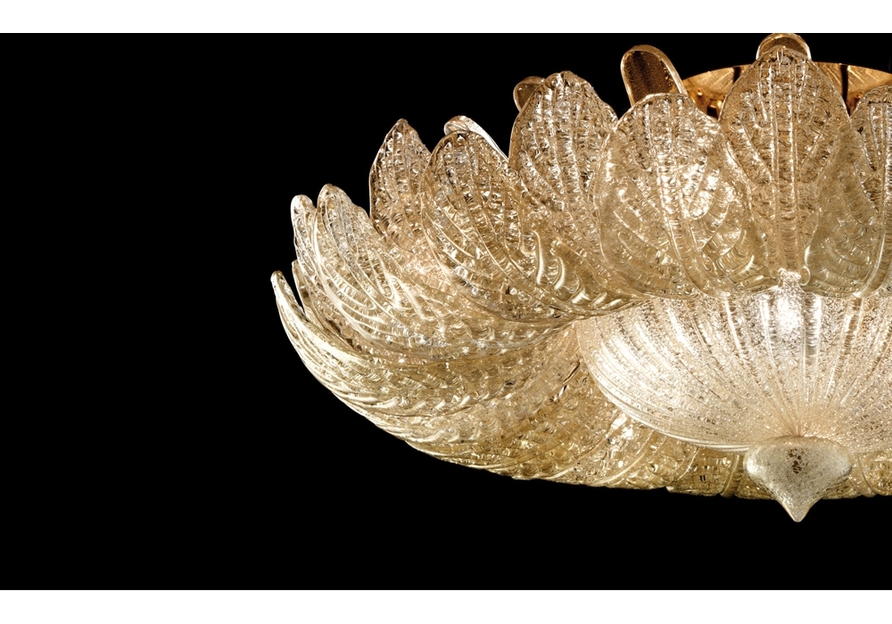 Rex conçu et produit par Barovier & Toso est un plafonnier avec structure portante et détails en métal couleur laiton brossé. Le diffuseur est structuré par diverses applications en verre vénitien et protège les sources lumineuses LED ou halogènes dimmables. Rex est disponible en différents modèles et finitions.