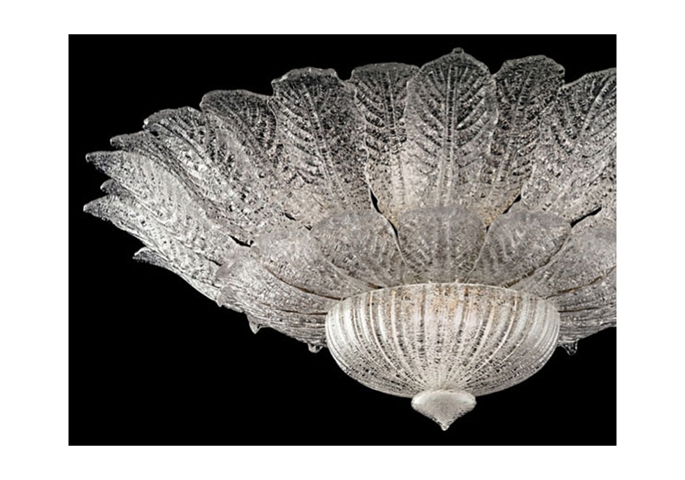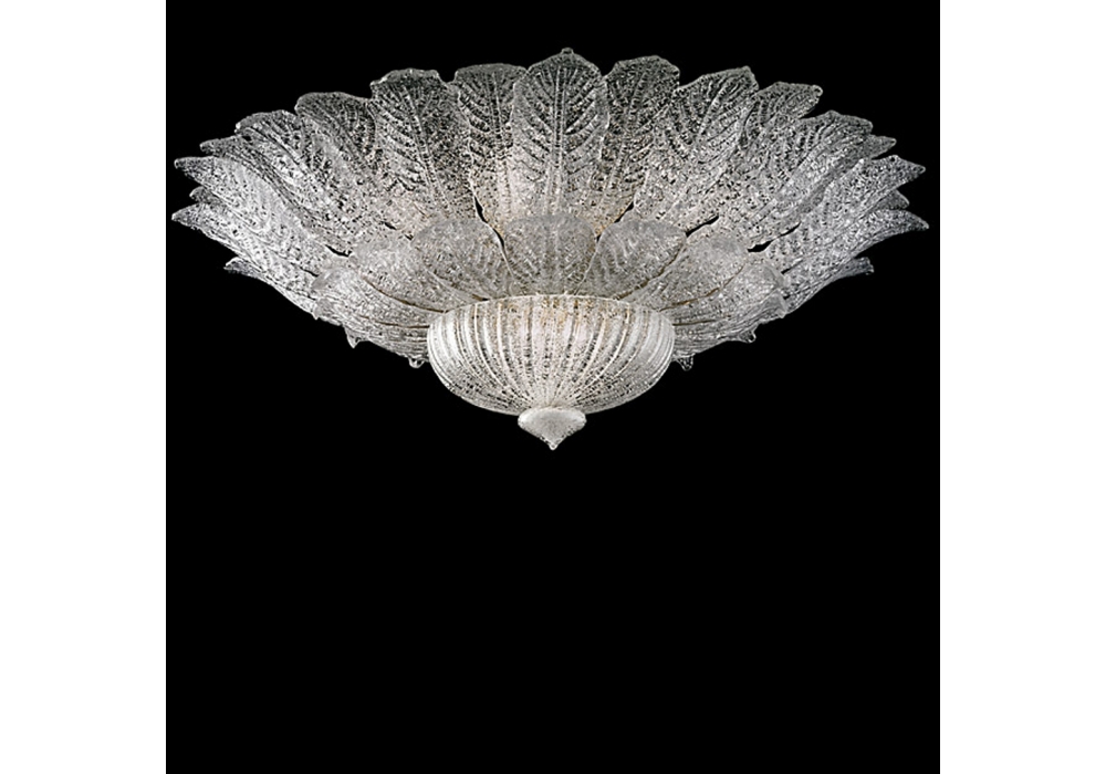 Excelsior conçu et produit par Barovier & Toso est un plafonnier avec structure portante et parties visibles en métal galvanisé doré. Le diffuseur est structuré par diverses applications en verre vénitien et protège les sources lumineuses LED ou halogènes dimmables. Excelsior est disponible en différents modèles et finitions de verre.