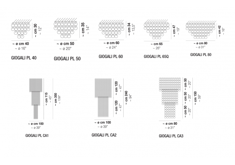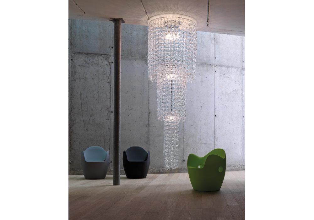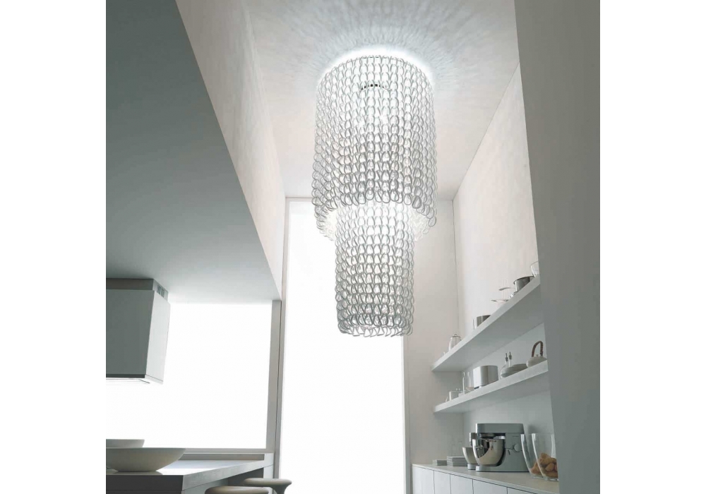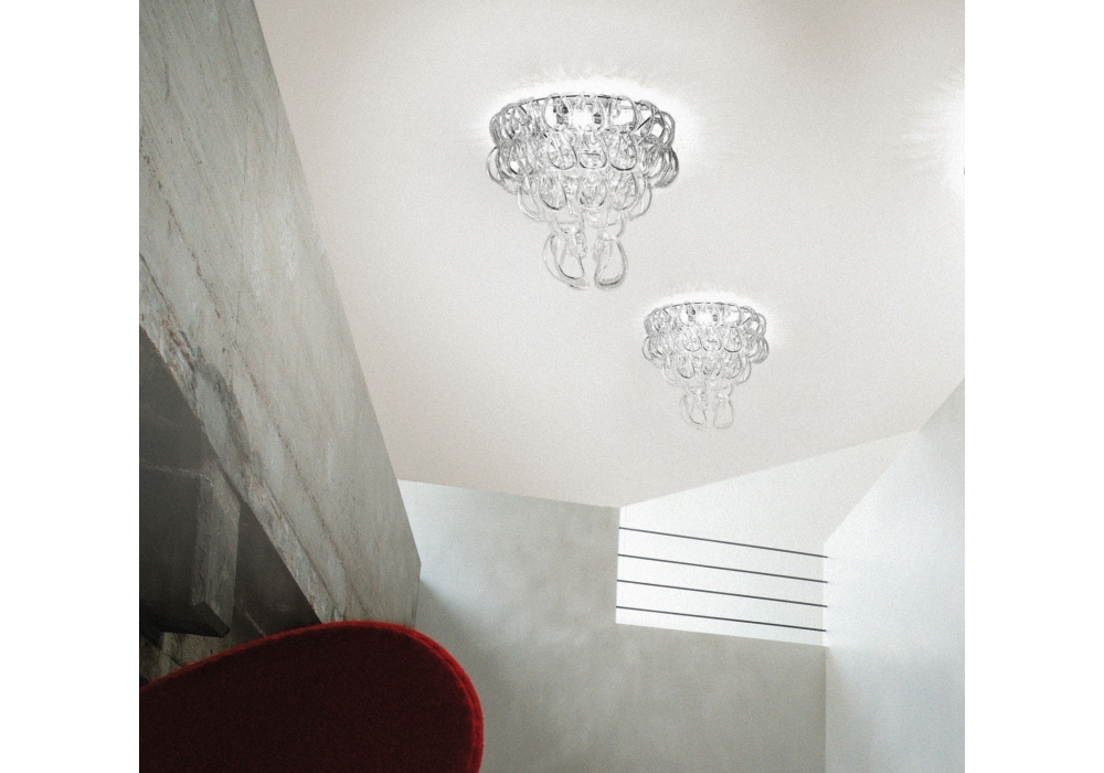 Giogali conçu par Angelo Mangiarotti pour Vistosi est un plafonnier avec structure portante en bronze mat ou métal chromé poli. Le diffuseur est structuré par plusieurs anneaux de verre de différentes finitions et adopte une source lumineuse LED ou halogène dimmable avec connexion E27. Giogali est disponible en différents modèles.