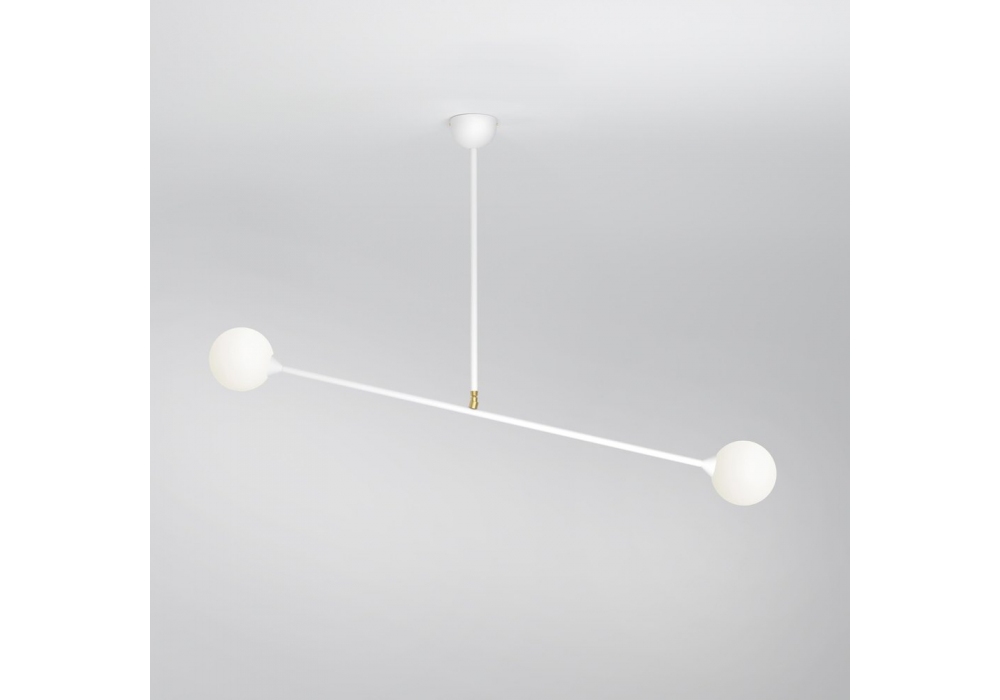 Two Spheres conçu par Atelier Areti est un plafonnier composé de finitions en poudre métallisée disponibles en noir ou blanc, en laiton et en abat-jour en verre.