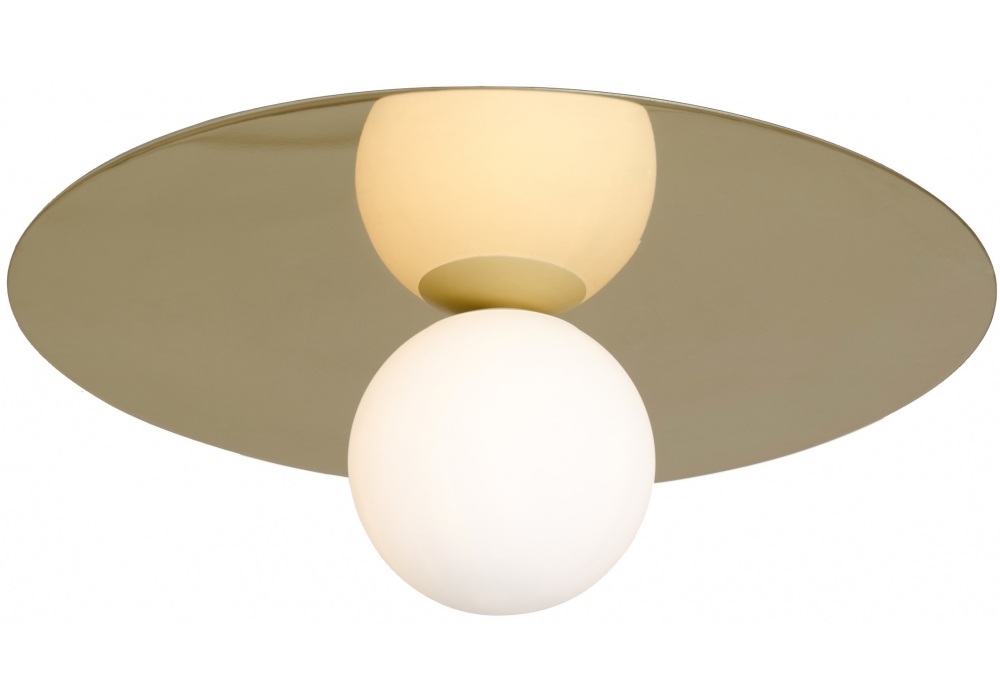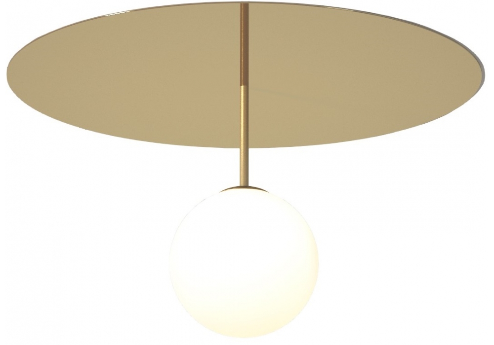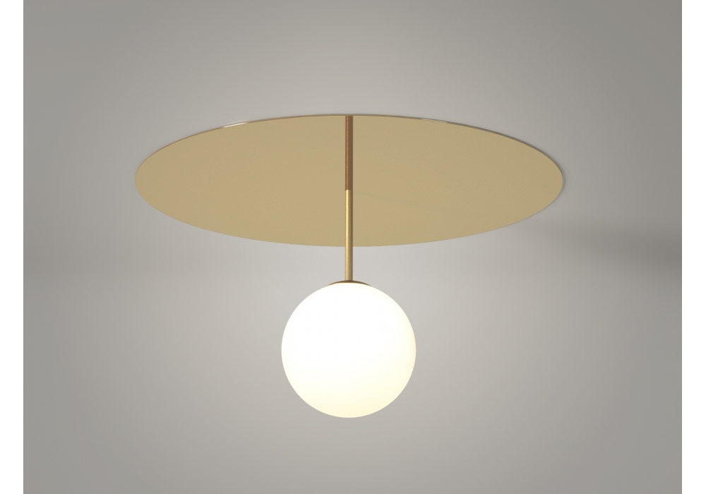 Plate And Sphere conçu par Atelier Areti est un plafonnier caractérisé par une structure en laiton poli avec un abat-jour en verre de forme sphérique. Disponible en deux versions et deux tailles.