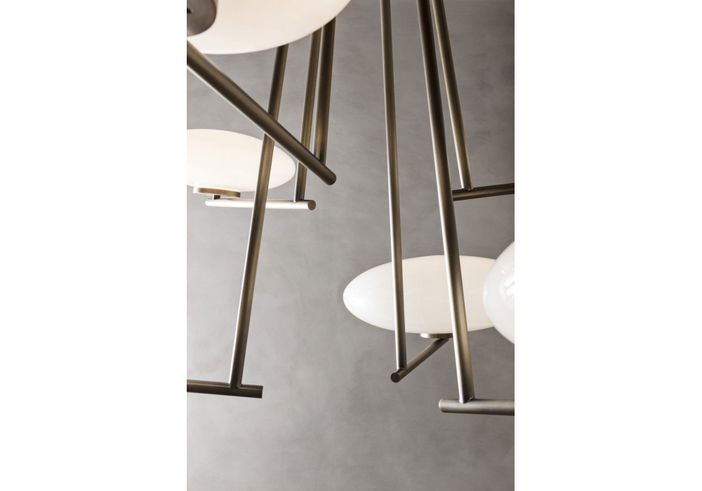 Mamì conçu par Umberto Asnago pour Penta est un plafonnier avec structure en métal couleur graphite ou bronze. Les diffuseurs sont en verre soufflé blanc et adoptent une source lumineuse LED dimmable. Mamì est disponible en différents modèles et nuances de source lumineuse.