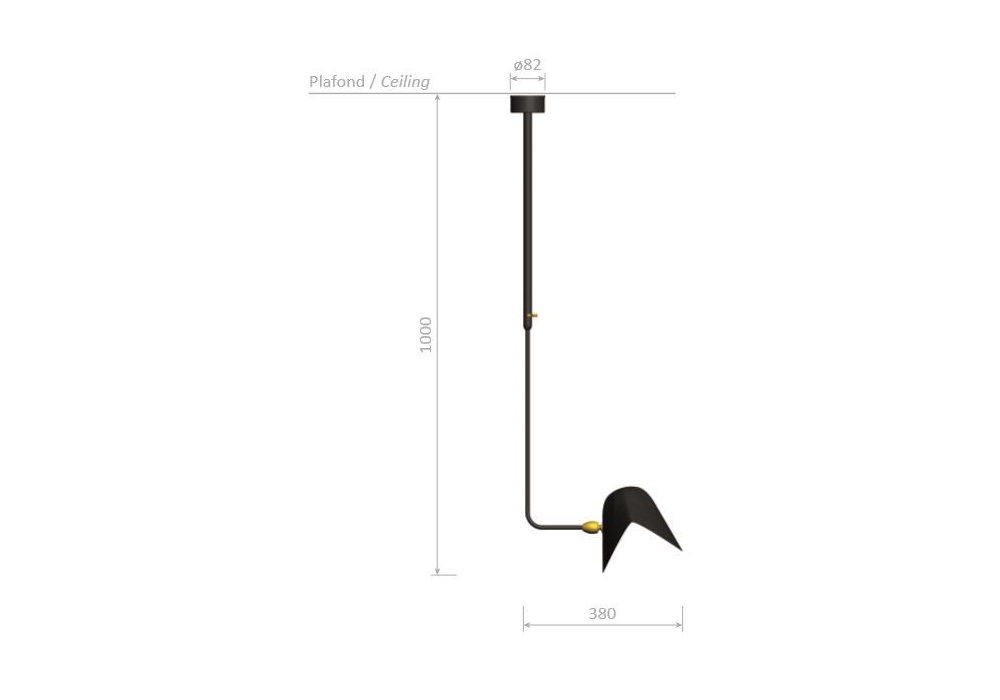 Bibliothèque Courbe conçu par Serge Mouille est une plafonnier, la réédition originale du modèle 1953. Il a 1 bras courbe en acier peinté noir, le réflecteur en aluminium laqué noir avec intérieur blanc, les joints en laiton. Ampoule: E27 42W halogène (inclus).