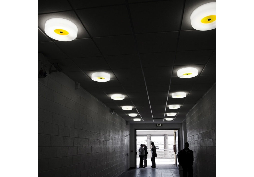 Corona conçue par Emiliana Martinelli pour Martinelli Luce est une applique ou plafonnier circulaire entièrement réalisée en méthacrylate blanc opale. La source lumineuse retenue est de type LED intégrée. Corona est disponible en différentes tailles.