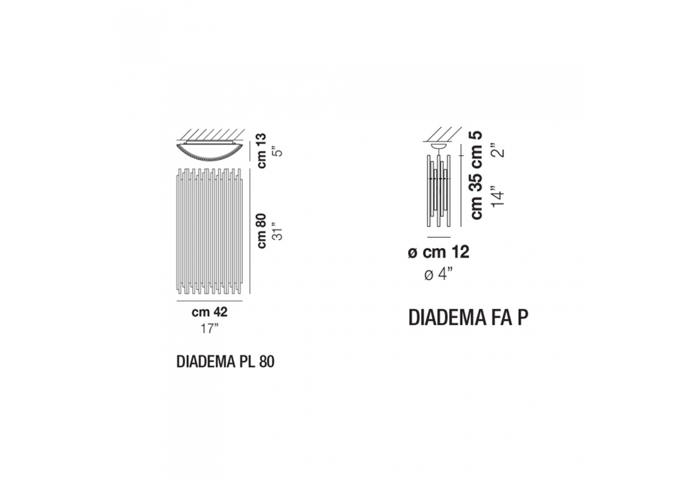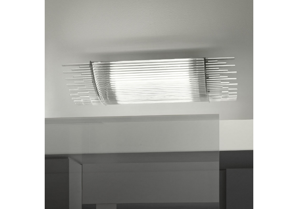 Diadema conçu par Romani Saccani Architetti Associati pour Vistosi est un plafonnier avec structure portante en métal peint. Le diffuseur est structuré par une série d'éléments en cristal tubulaires placés côte à côte et adopte une source lumineuse avec connexion R7S ou G9 de type LED ou halogène dimmable. Diadema est disponible en deux versions différentes.