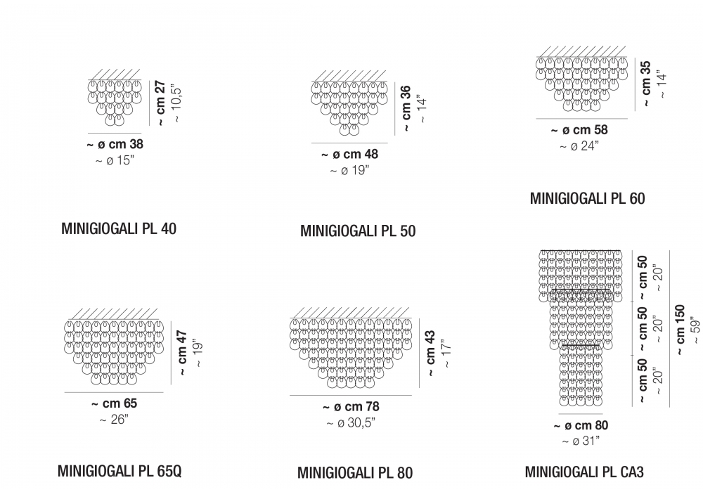 Minigiogali conçu par Angelo Mangiarotti pour Vistosi est un plafonnier avec structure portante en métal peint. Le diffuseur est structuré par de multiples anneaux de verre et adopte une source lumineuse avec connexion E14/E27 de type halogène ou LED dimmable. Minigiogali est disponible en différents modèles et finitions.