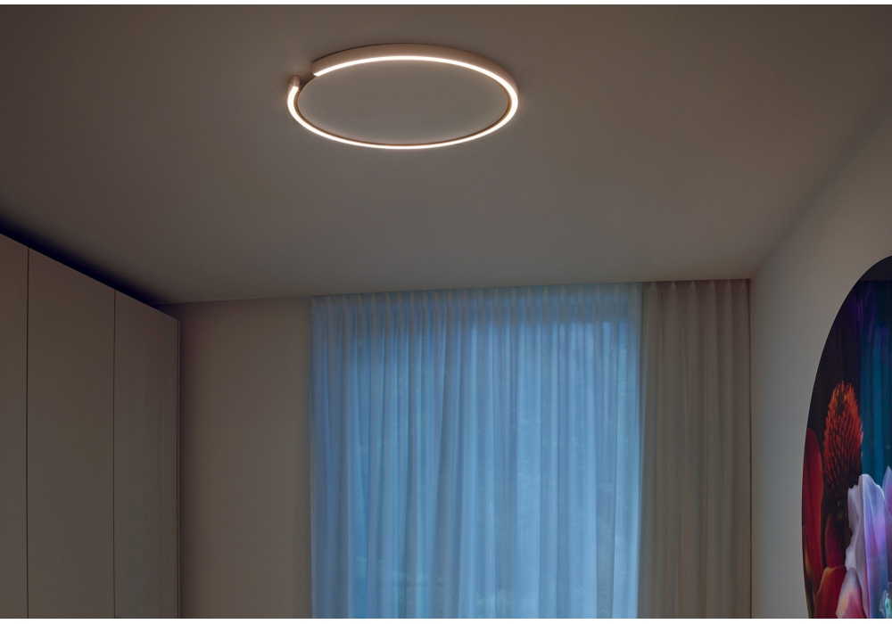 Mito Soffitto 60 conçu par Occhio est un plafonnier / applique en aluminium peint, acier avec revêtement PVD, plastique et silicone optique. Fondu de 2700 à 4000 K et faisceau lumineux de 50° ou 80°. Il est également possible de choisir la commande d'éclairage. Disponible en différentes finitions et modèles.