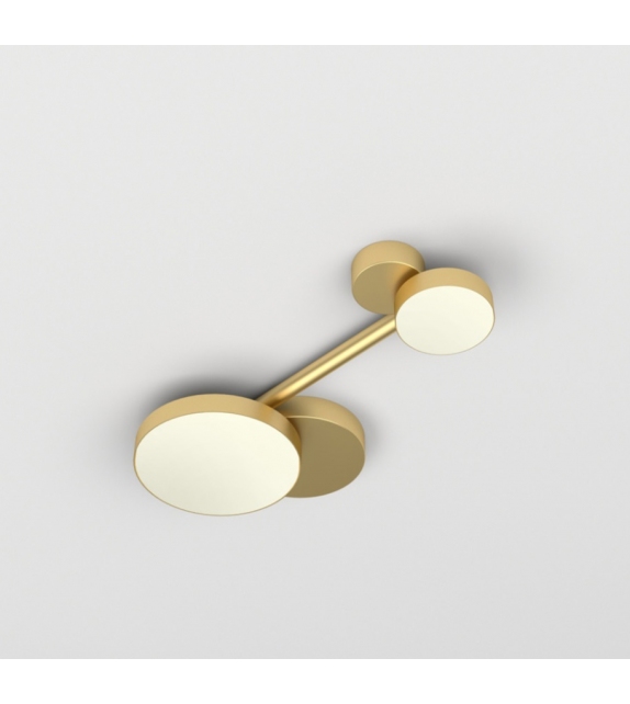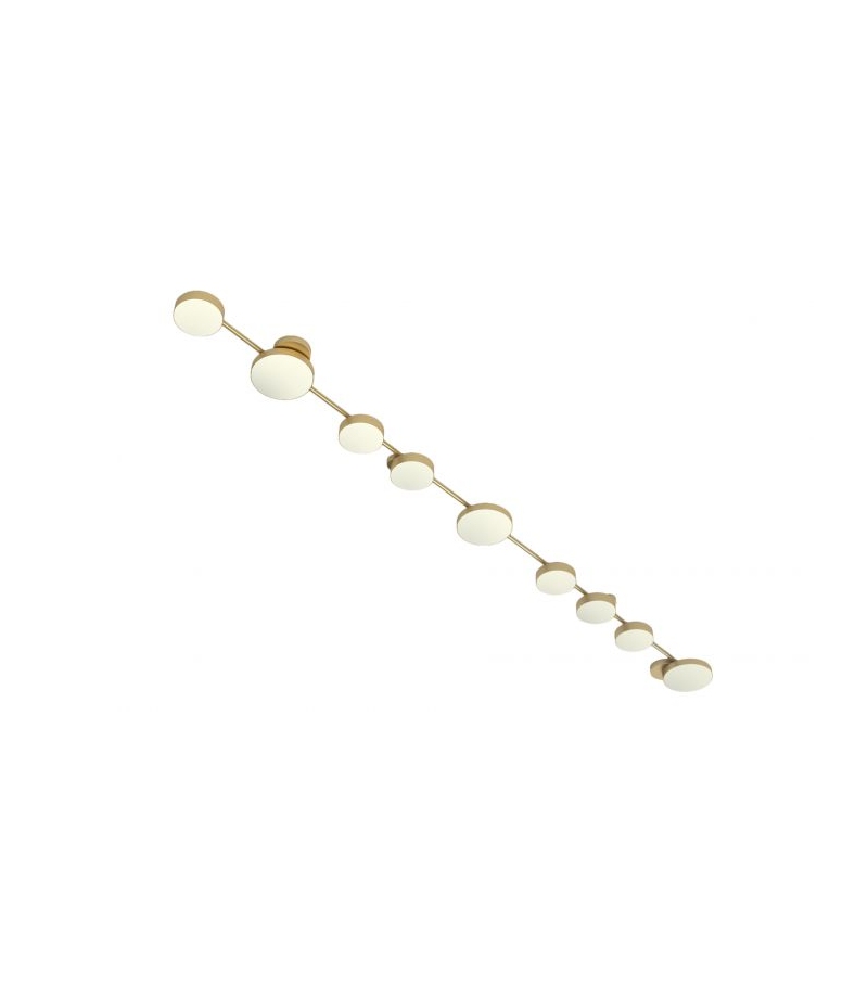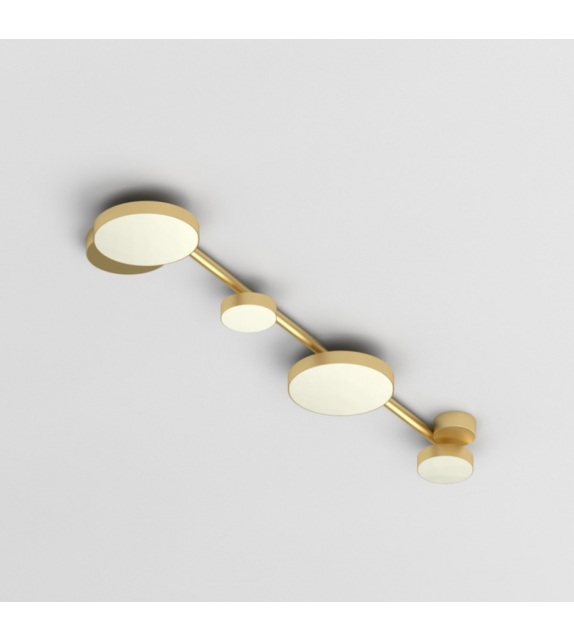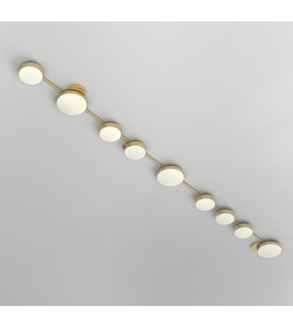Line Discs conçu par Atelier Areti est un plafonnier avec structure en laiton brossé et diffuseur en acrylique blanc. Disponible en différents modèles.